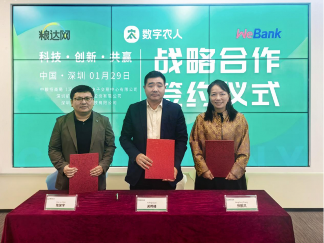 2026年1月29日,中粮招商局(深圳)粮食电子交易中心有限公司(以下简称粮达网)、深圳数字农人科技有限公司、深圳前海微众银行股份有限公司,在深圳正式签署三方战略合作协议。此次签约标志着三方将整合大宗农粮交易、农产品流通合规管理、供应链金融服务三大核心能力,共同打造农粮产业链“交易 + 合规 + 资金” 一体化解决方案,助力农粮产业数字化转型与高质量发展。