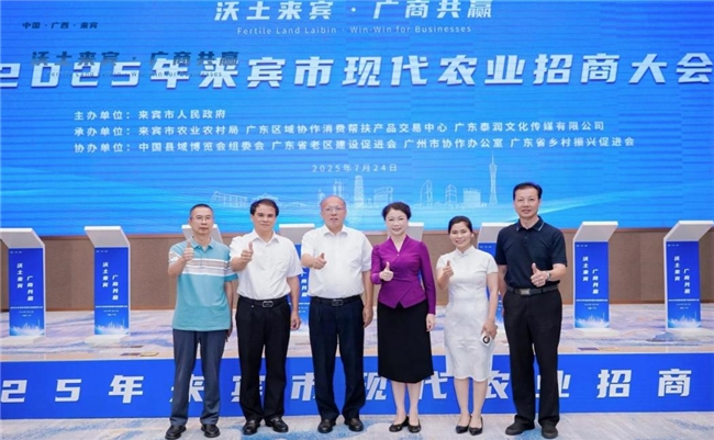 为贯彻落实关于广西工作的重要论述,深入推进与粤港澳大湾区的农业产业对接,助力来宾市现代农业产业迈向高质量发展新征程,2025年7月24日上午,来宾市人民政府在广州市举办2025年来宾市现代农业招商大会。本次活动由来宾市人民政府主办,来宾市农业农村局、广东区域协作消费帮扶产品交易中心、广东泰润文化传媒有限公司承办,中国县域博览会组委会、广东省老区建设促进会、广州市协作办公室、广东省乡村振兴促进会提供支持,来宾市领导、市农业农村局等相关单位、县市区分管领导、部门负责人、特邀企业代表以及大湾区企业代表、商协会代表、特邀嘉宾等100多人共襄盛举,活动取得圆满成功。
